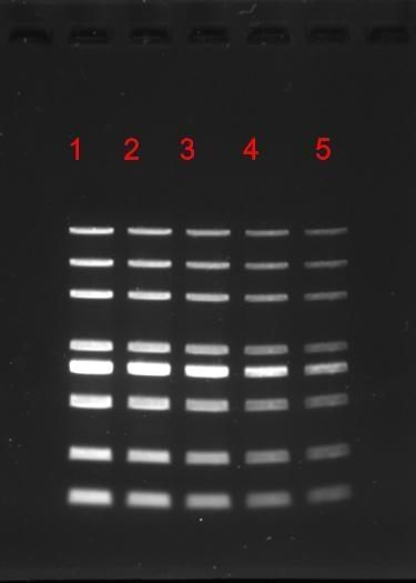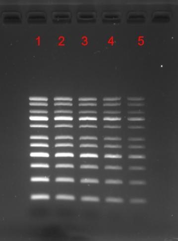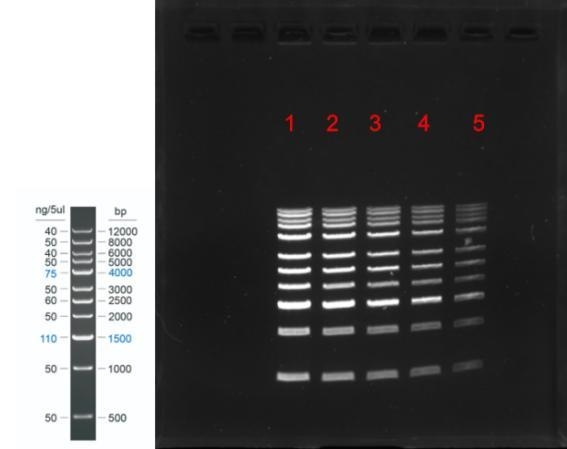 1% Agarose Gel. Lane 1: D5000 ladder (5 μL); Lane 2: 4 μL; Lane 3: 3 μL; Lane 4: 2 μL; Lane 5: 1 μL)